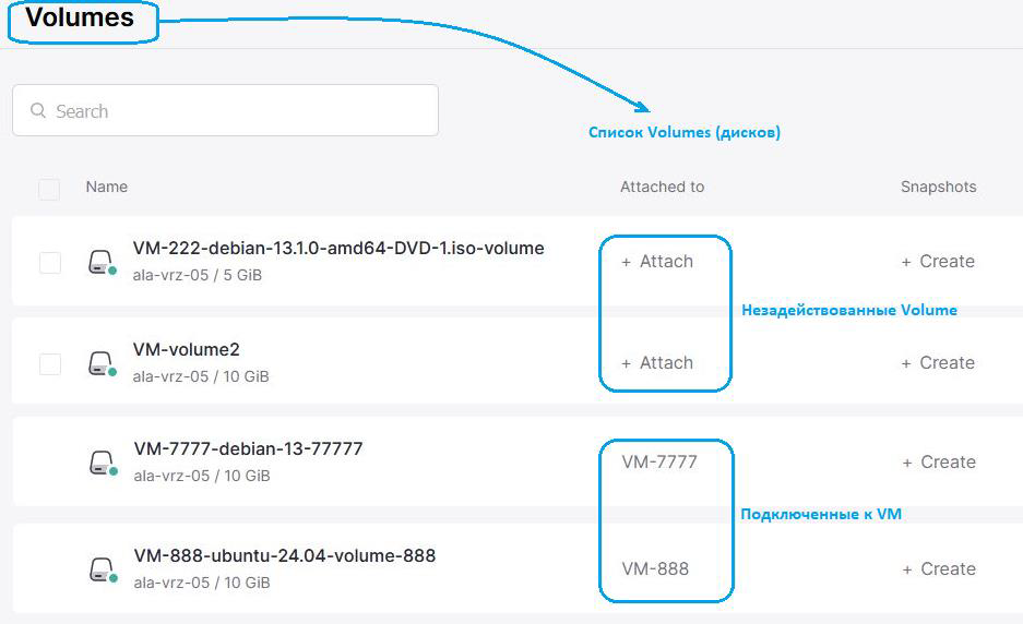 Список Volumes (дисков) виртуальных машин: