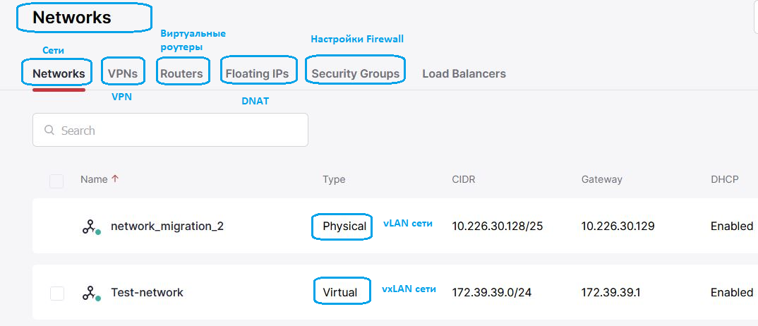 Сети могут быть виртуальными (VXlan) или физическими (Vlan).