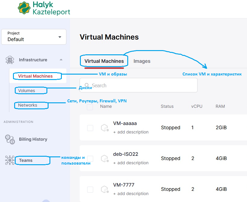 При любой иной конфигурации (несколько внешних сетей; vLAN заведённый с colocation; сеть доступная в нескольких Project или площадках [Regions]) – обратитесь в службу поддержки Казтелепорт. - Проекты и пользователи