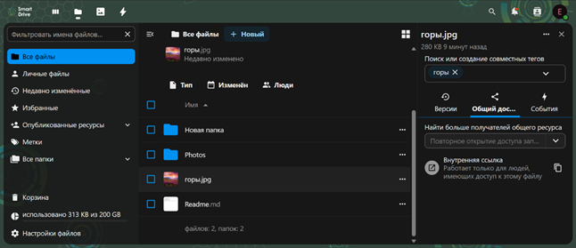 Вы можете присваивать метки файлам. Чтобы создать метки, откройте файл в режиме просмотра «Детали». Затем введите теги. Чтобы ввести несколько меток, нажимайте клавишу «Ввод» после создания каждой метки. Все метки являются системными и доступны всем пользователям вашего сервера SmartDrive.