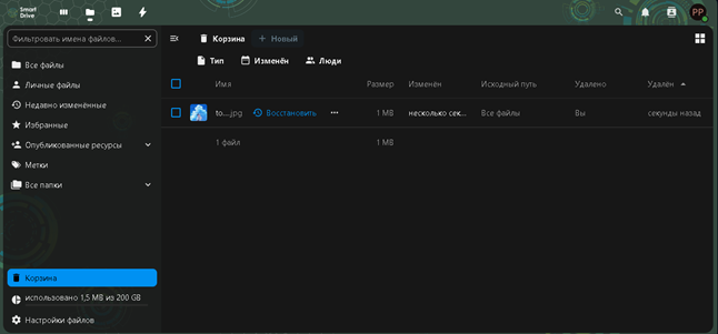 Найдите удаленные файлы, нажав кнопку Удаленные файлы на странице Файлы веб-интерфейса SmartDrive. У вас будет возможность либо восстановить, либо окончательно удалить файлы.